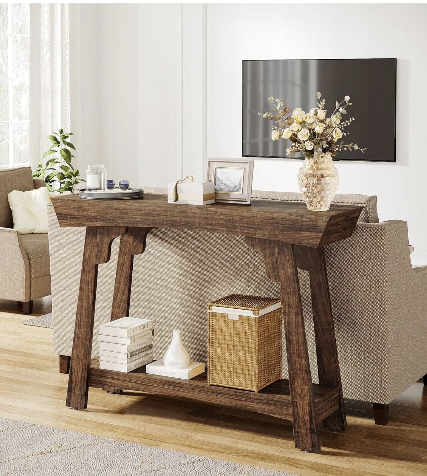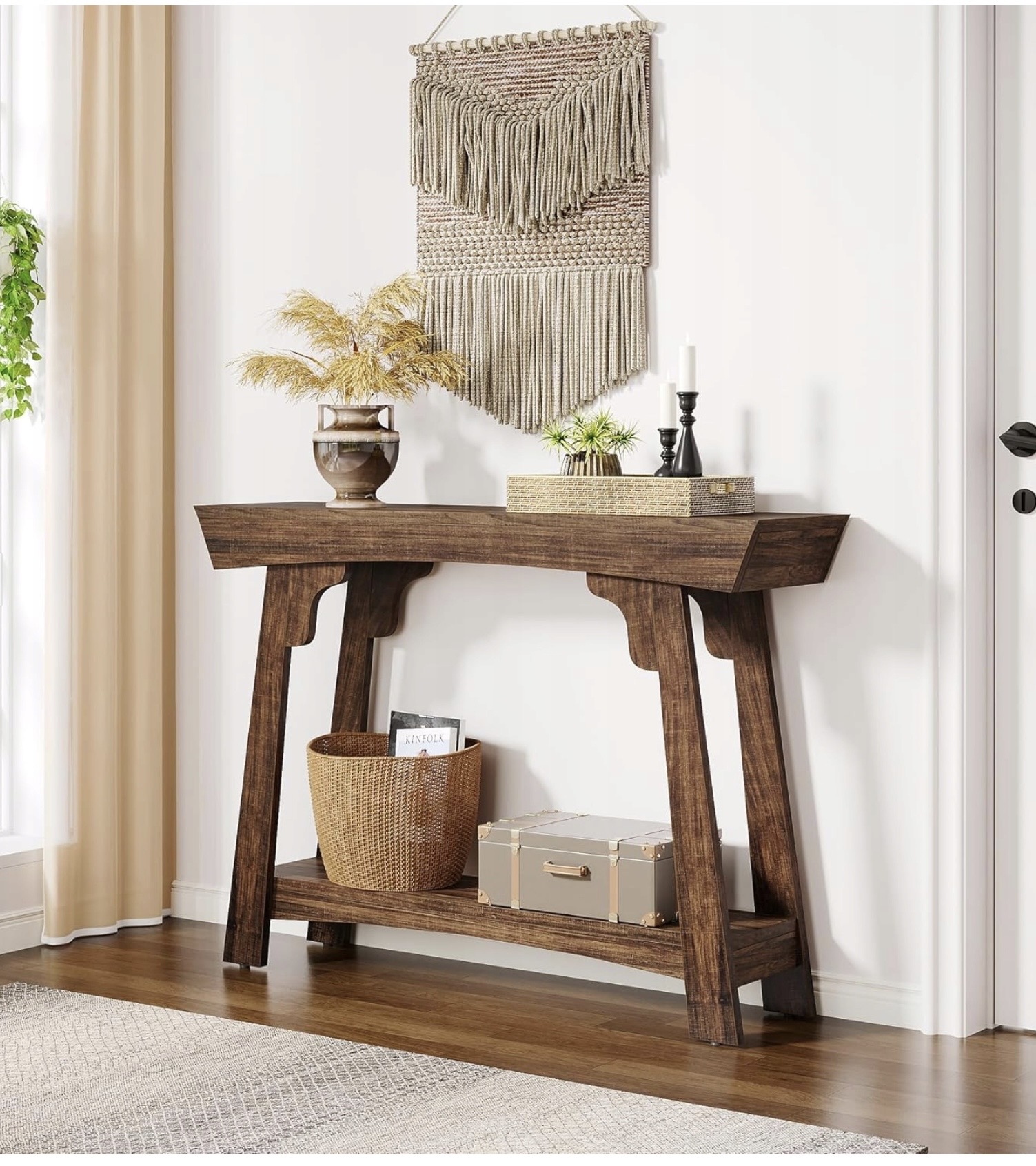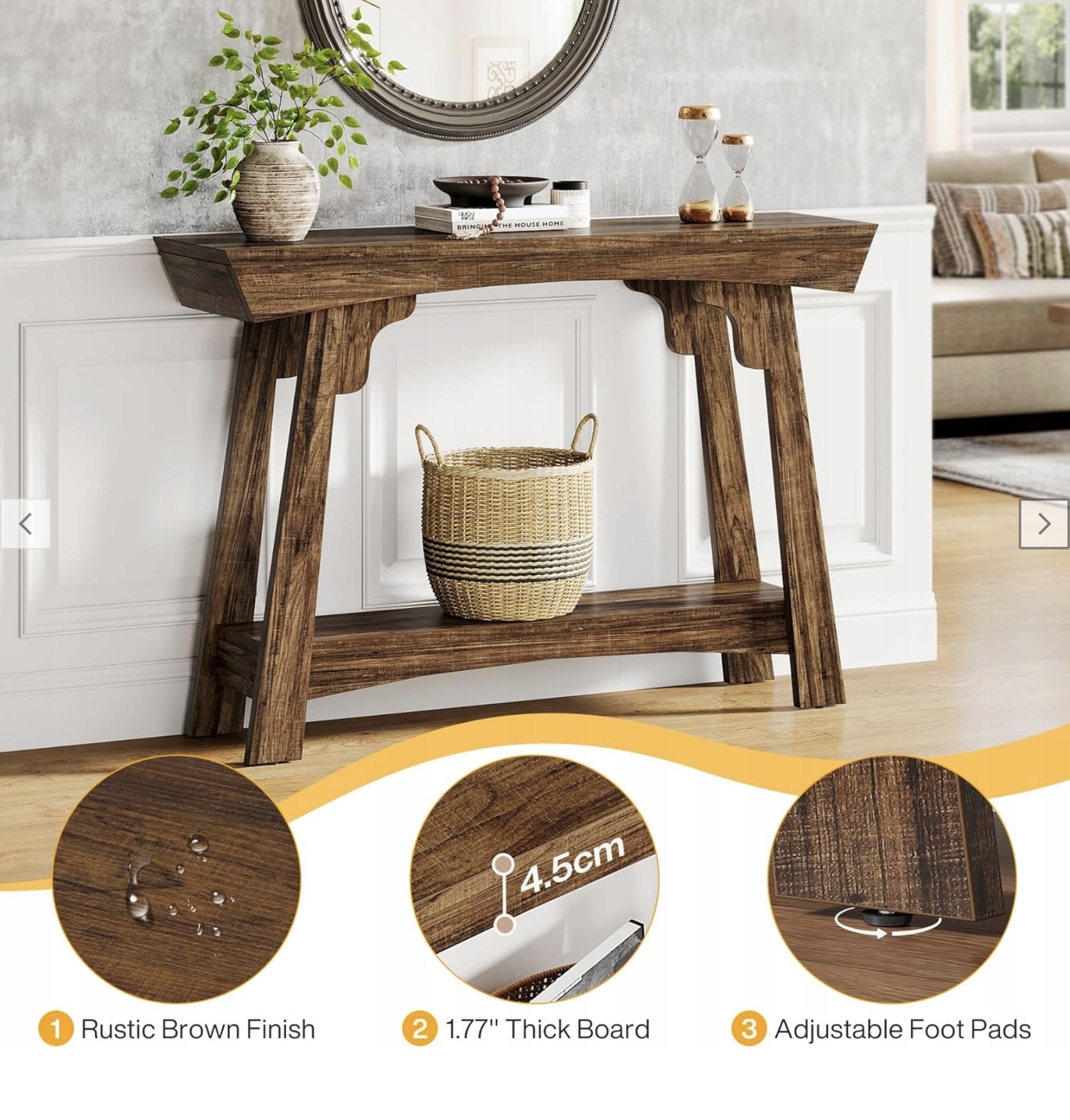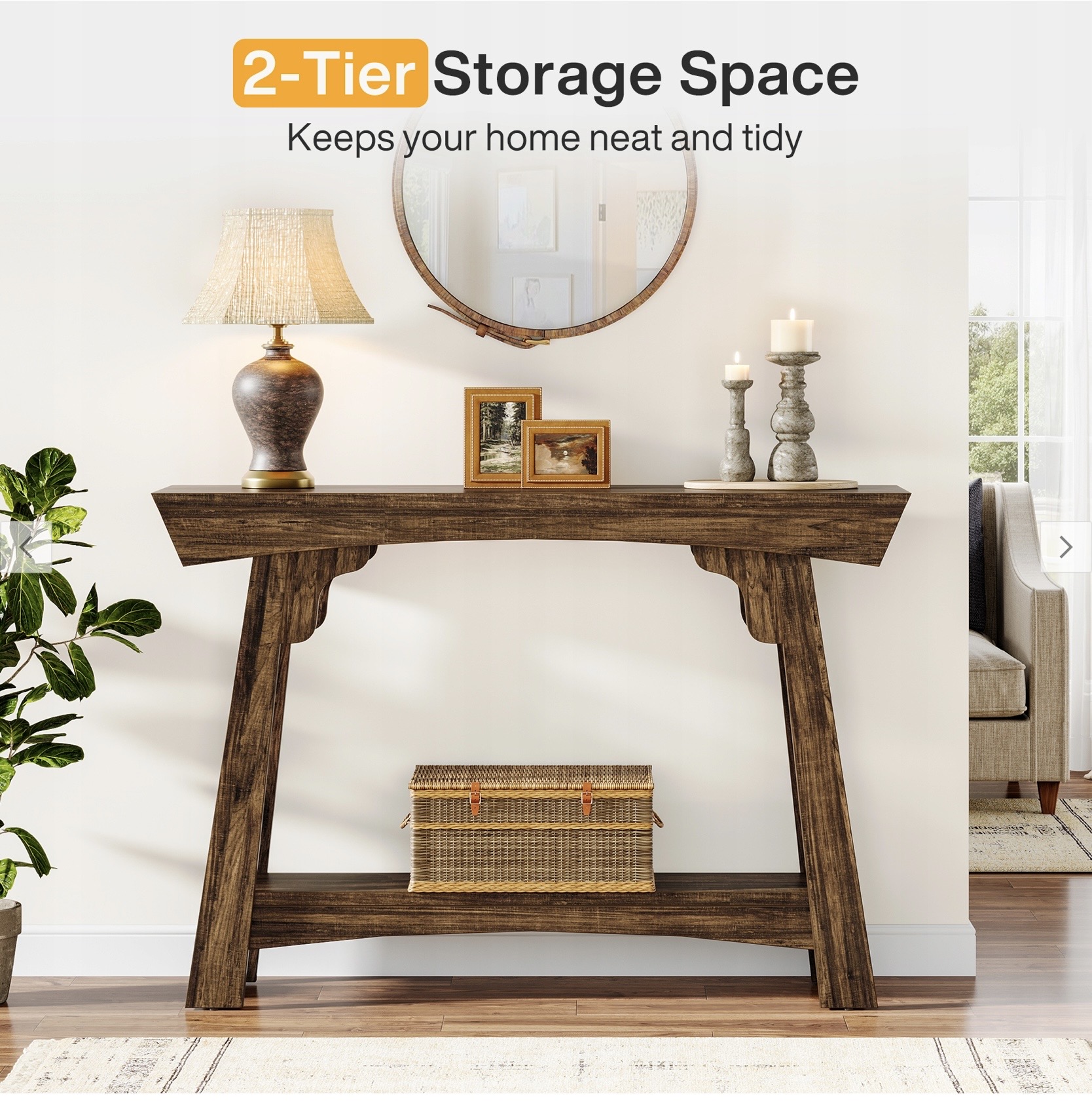 A felső polc ideális lehet lámpának, vázának, kulcsoknak, táskáknak vagy kisebb dekorációknak, míg az alsó polc plusz helyet kínál tárolókosaraknak vagy egyéb kiegészítőknek. A mindössze 11,81 hüvelykes, vagyis körülbelül 30 cm-es mélység miatt ez a modell különösen jól használható keskeny előszobákban, átjárókban vagy fal mellé helyezve.