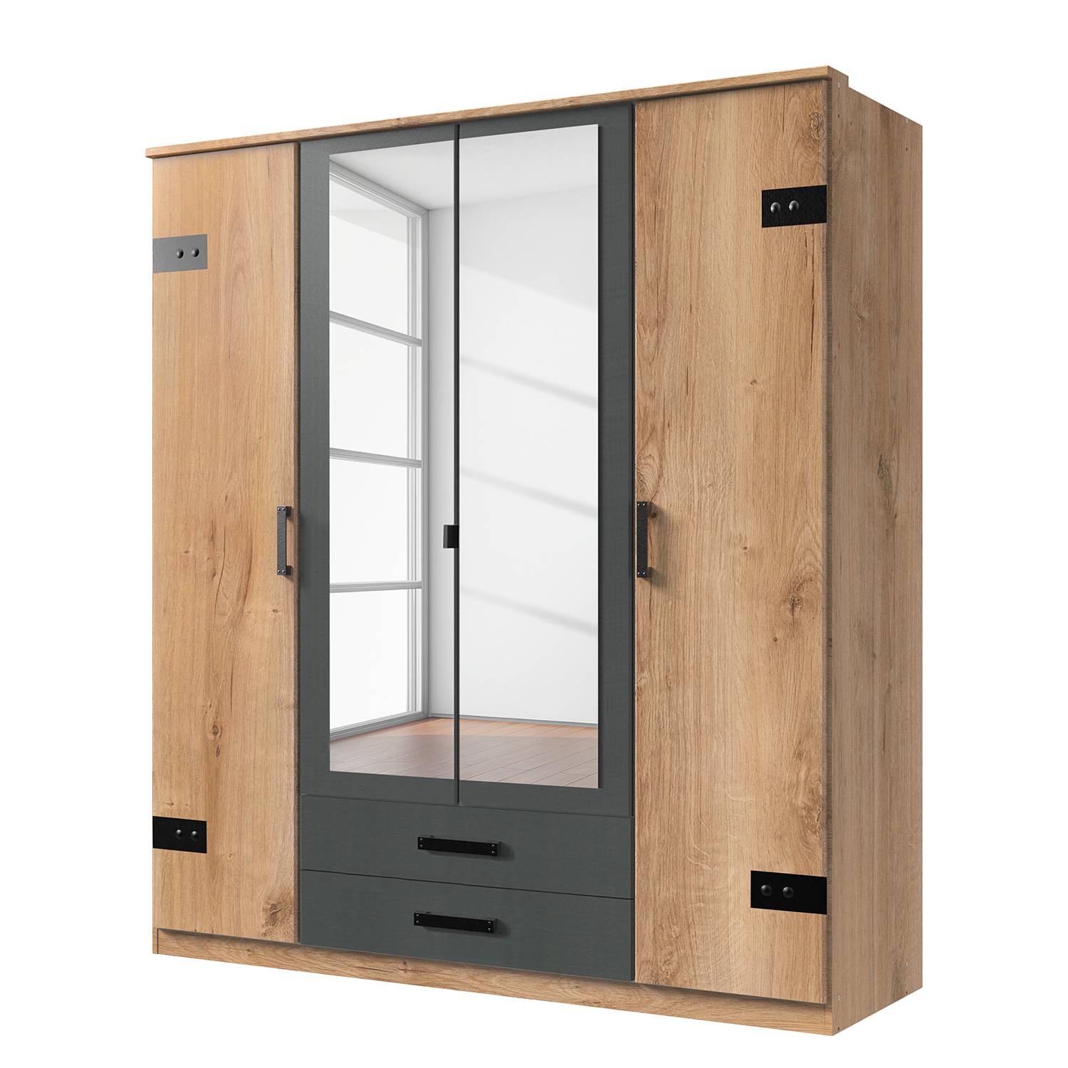 Cork nyílóajtós szekrény 180 cm, plank tölgy–grafit színben, tükrös ajtókkal – T25