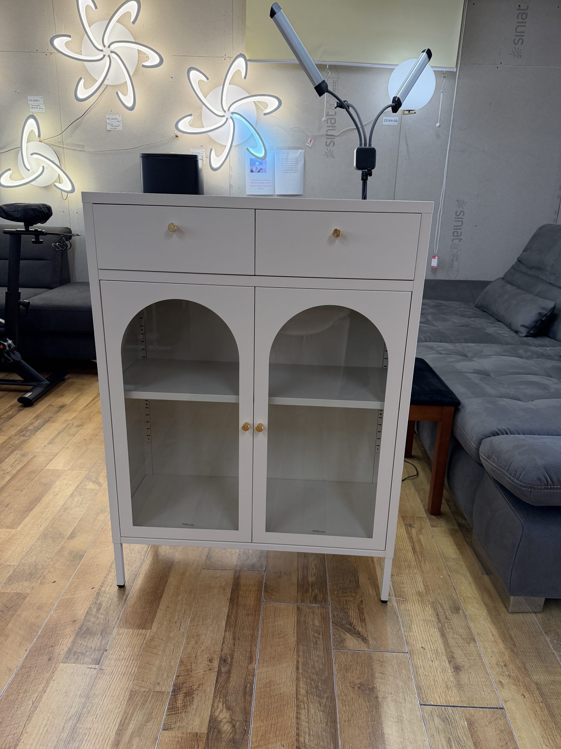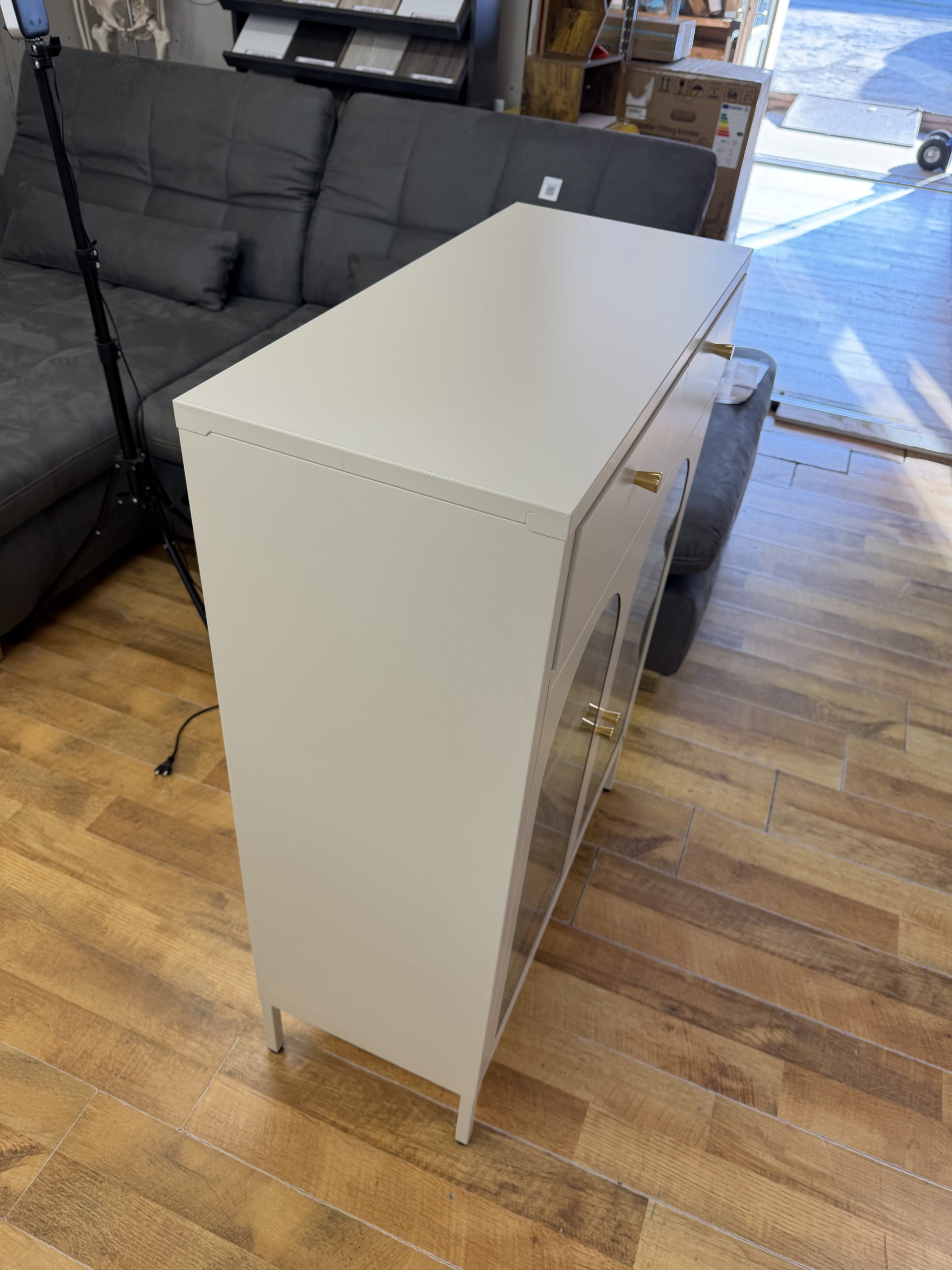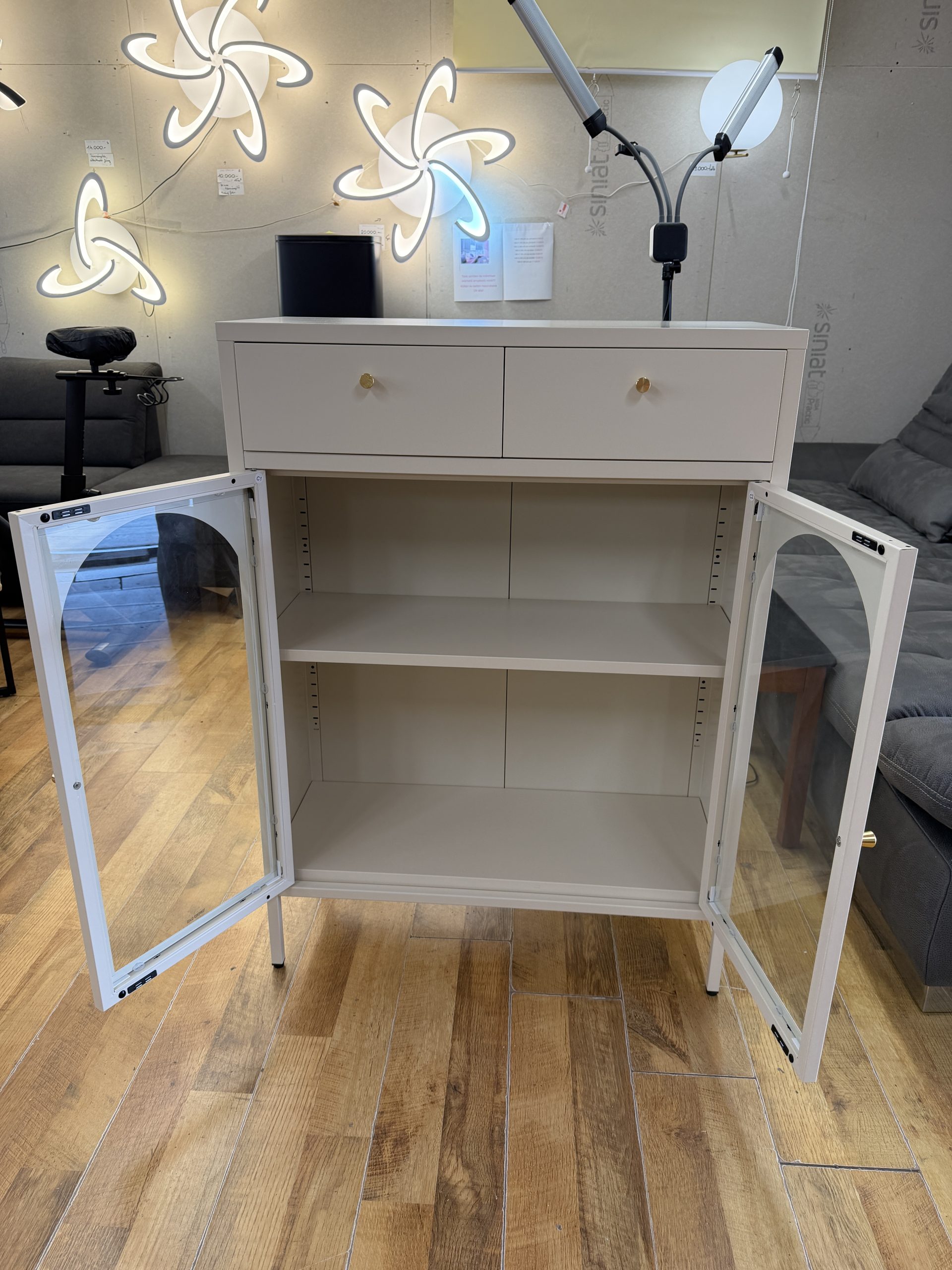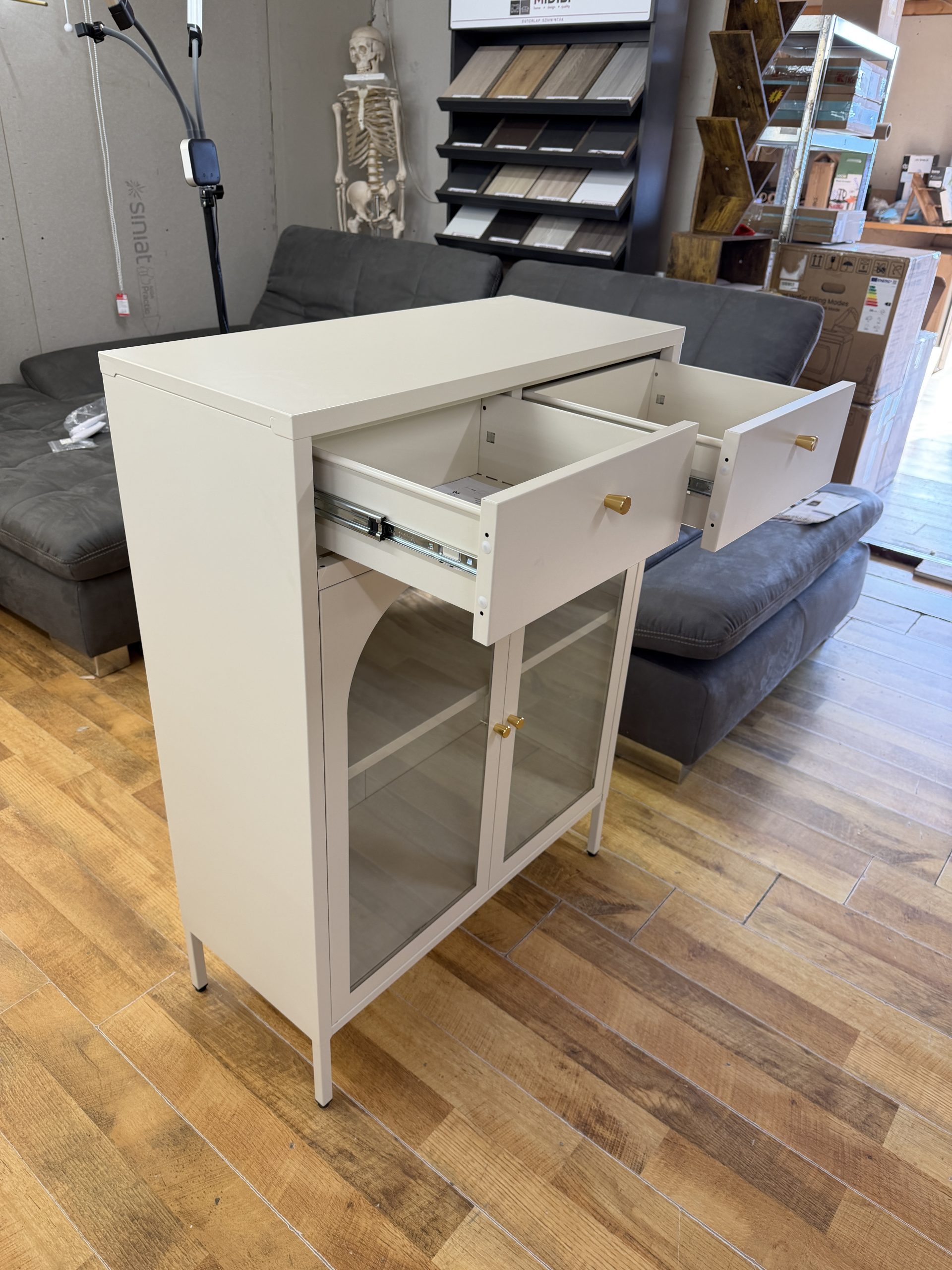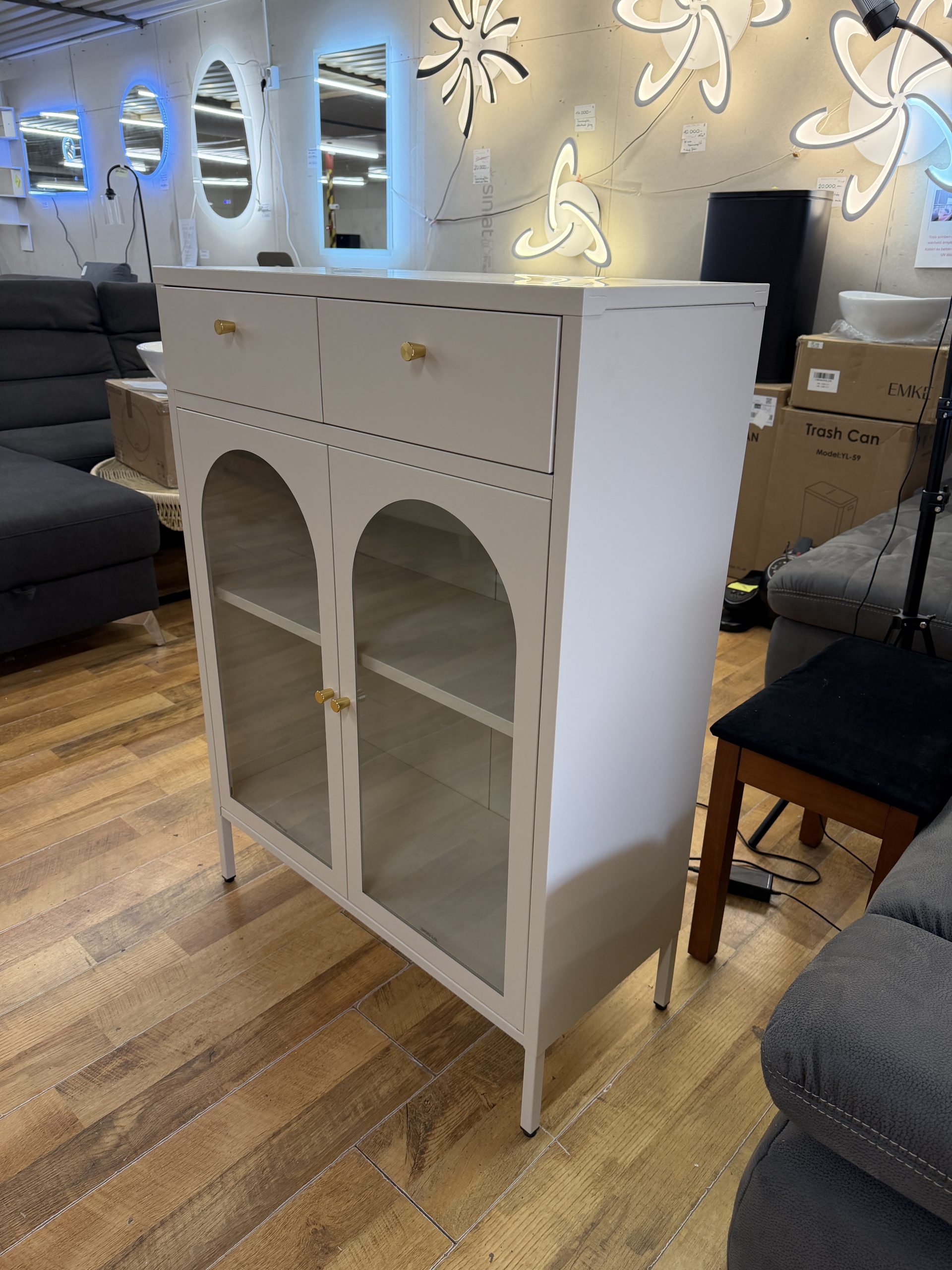 Letisztult, modern fém tálalószekrény, ami egyszerre dekoratív és praktikus: 2 fiók + 2 szekrényajtó mögötti polcos tárolótér, krém színben. A fémváz stabil, a frontnál  sima üveg van, így a tartalom elegánsan “látható”, mégis rendezett hatást kelt.