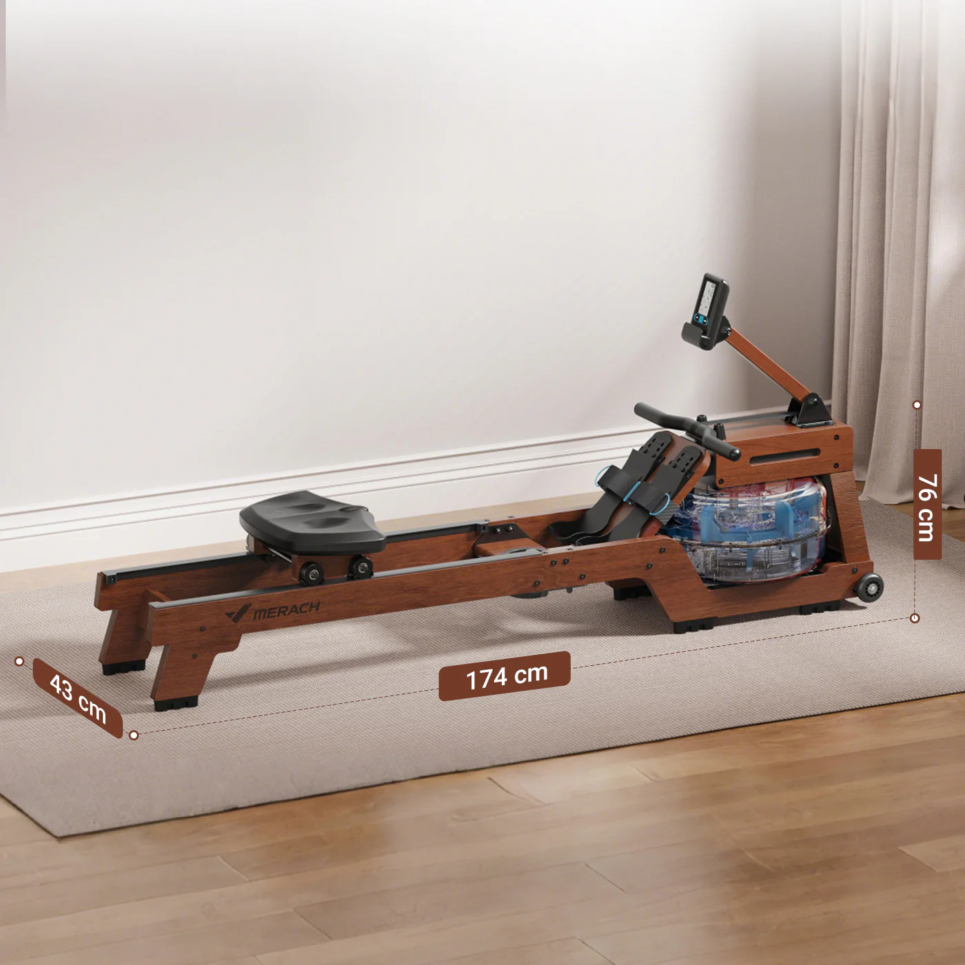 A MERACH R14 vízi evezőgép kiváló választás otthoni edzéshez, ha egy természetes mozgásérzetet adó, stabil és igényes kialakítású evezőpadot keresel. A készülék 22 literes beépített víztartállyal működik, amely valósághűbb evezési élményt nyújt, és a húzás intenzitásával együtt dinamikusan reagáló ellenállást biztosít. A gyártói termékoldal kiemeli a masszív fa kivitelezést, a 150 kg-os terhelhetőséget, valamint a kényelmes, otthoni használatra tervezett kialakítást.