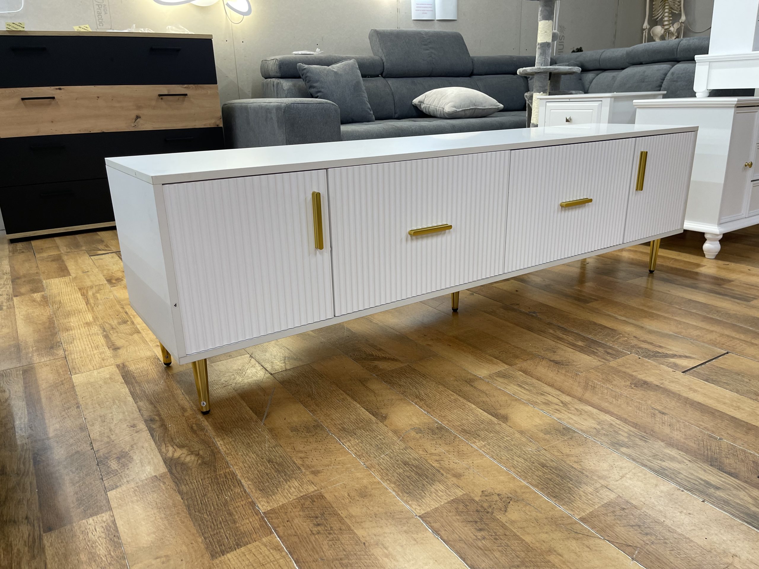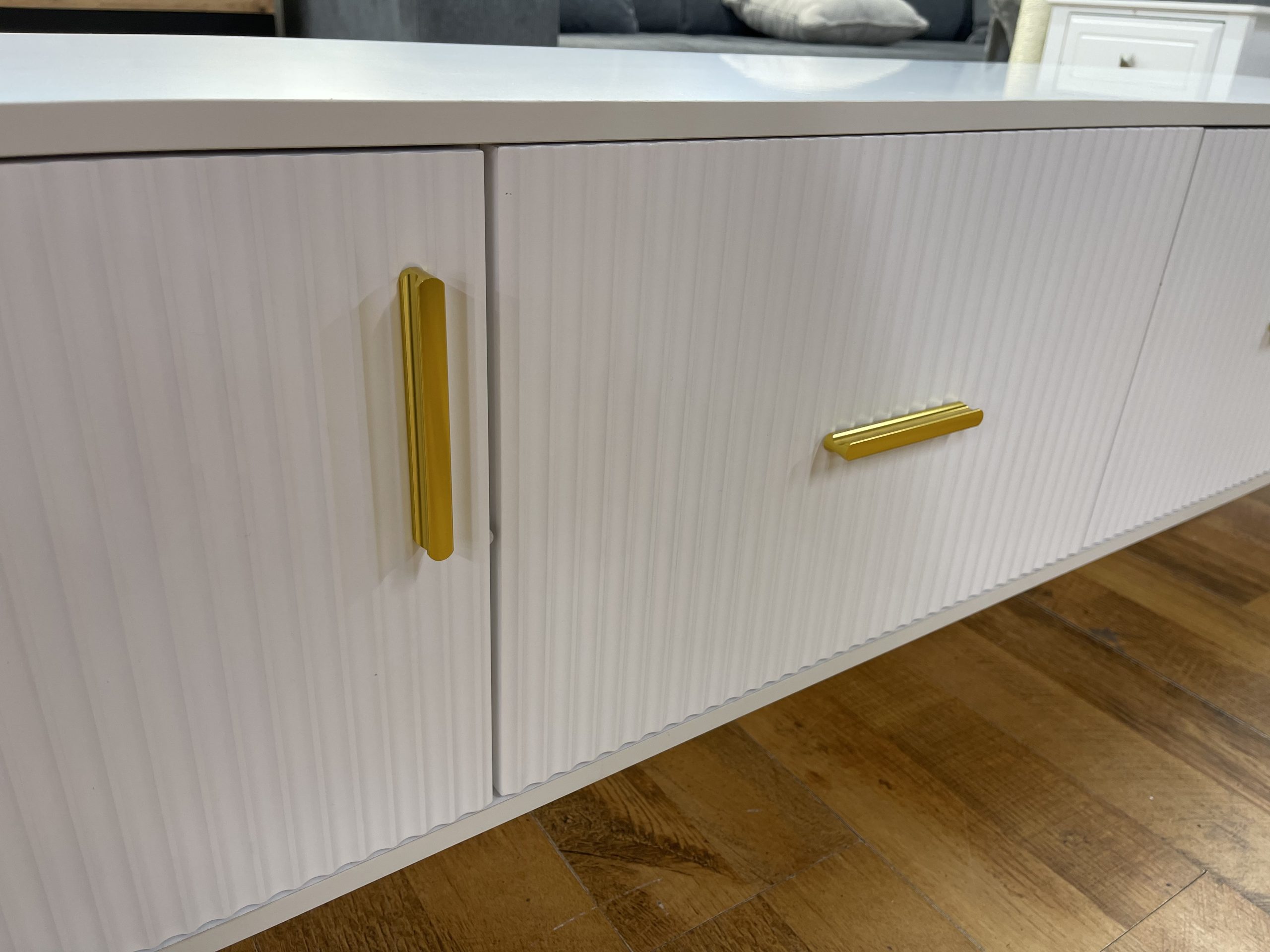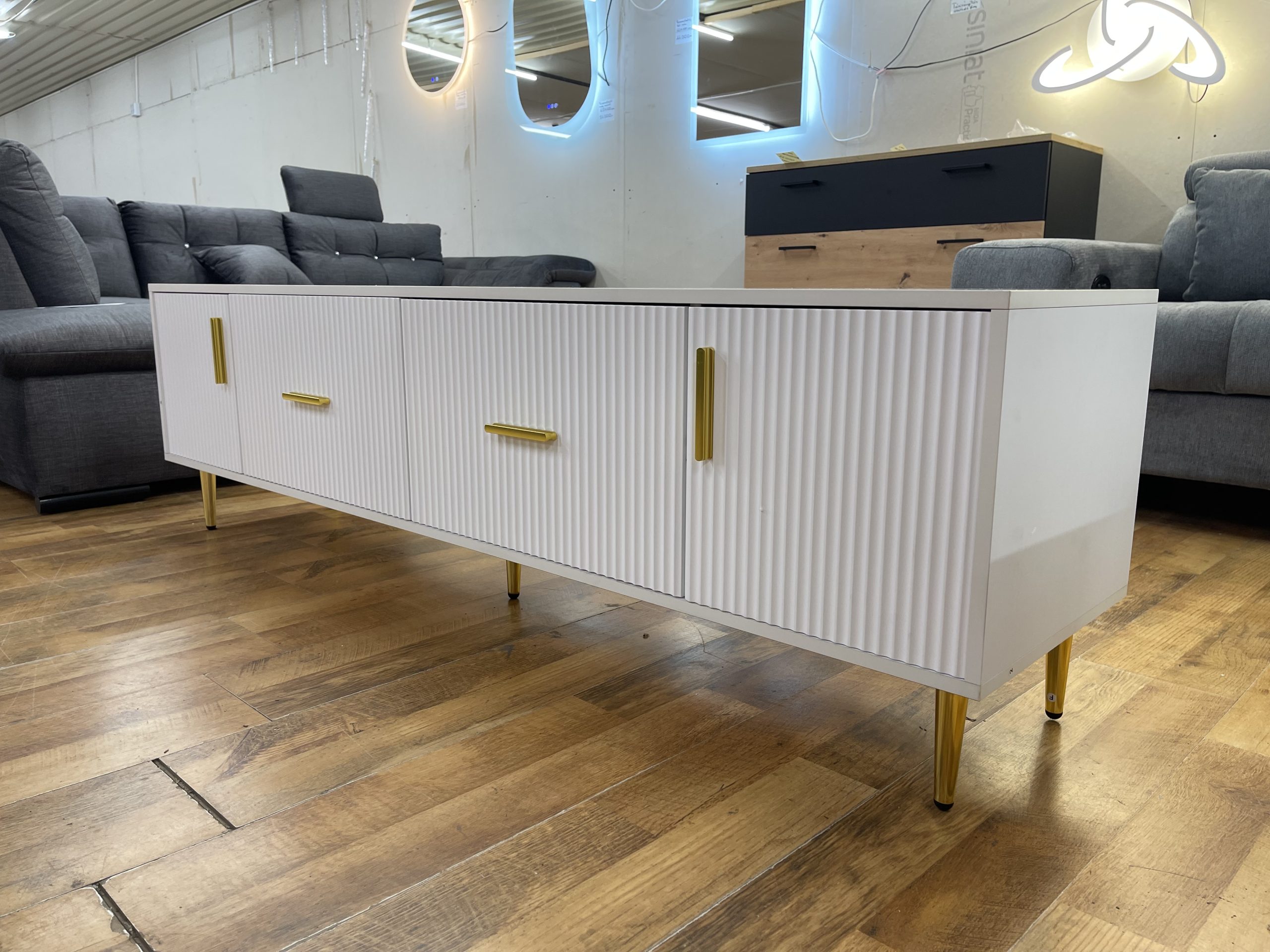 Modern fehér TV-állvány arany lábakkal és fogantyúkkal