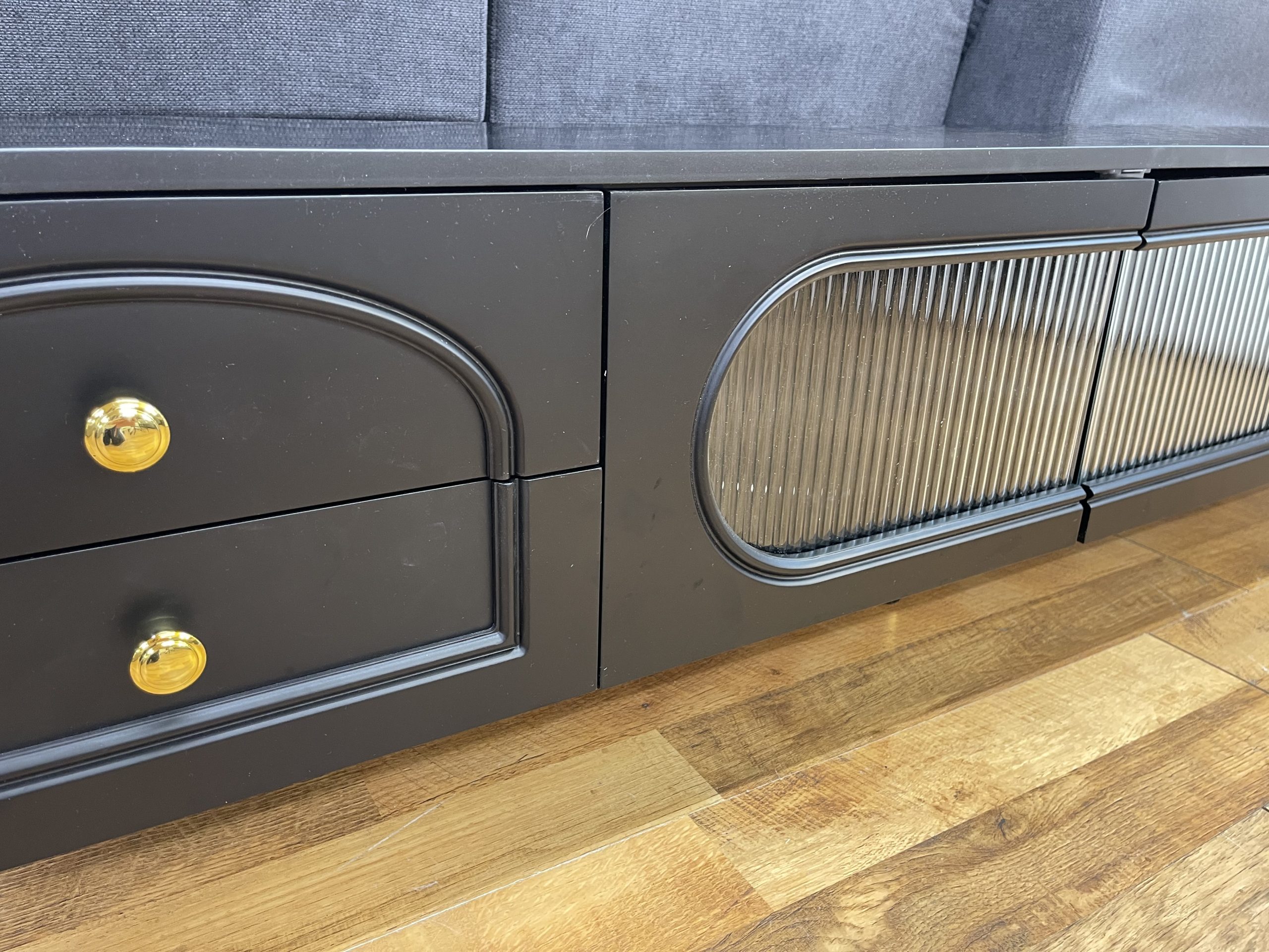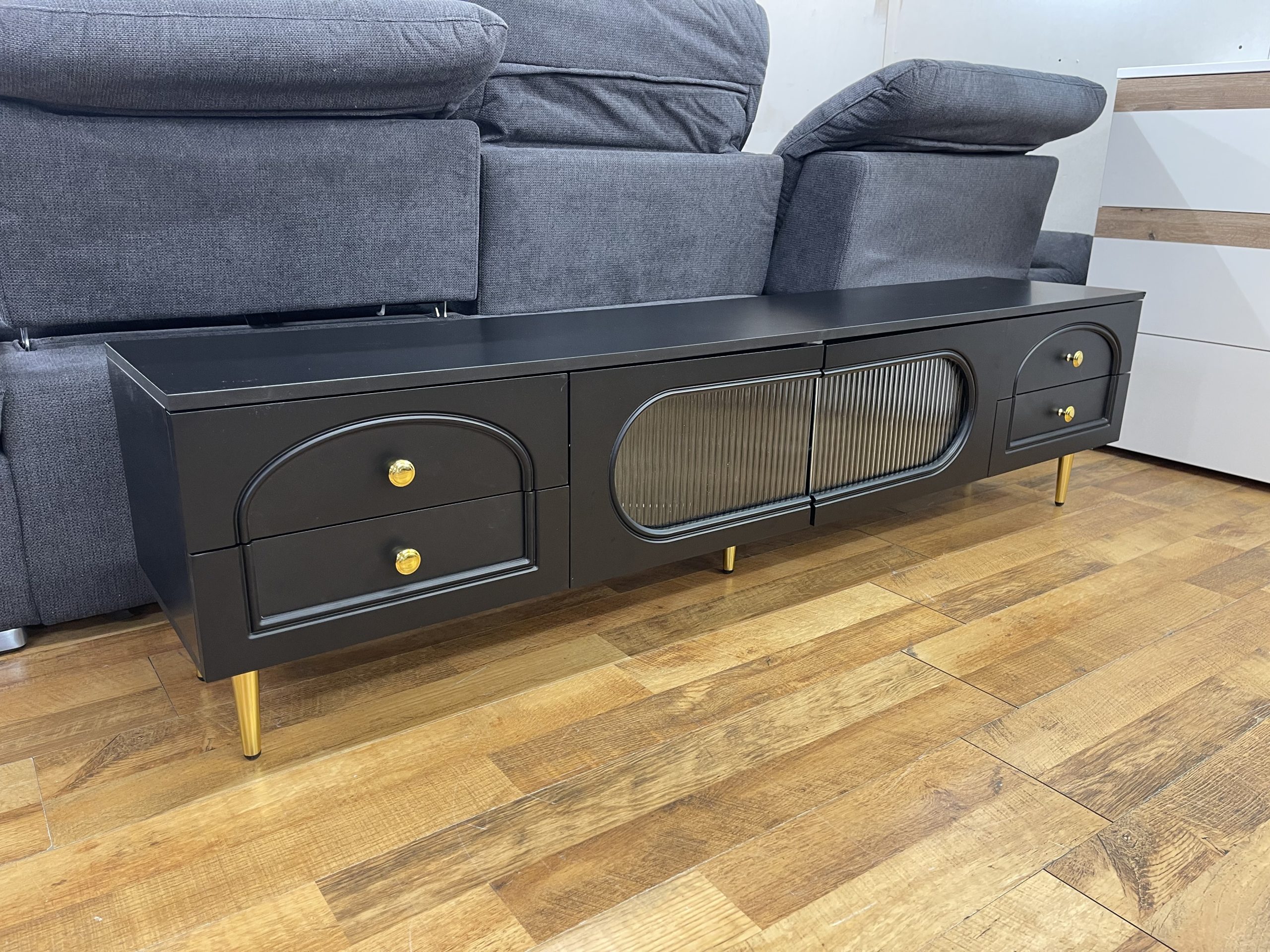 Modern fekete TV-állvány üveg betétes ajtókkal és arany részletekkel
