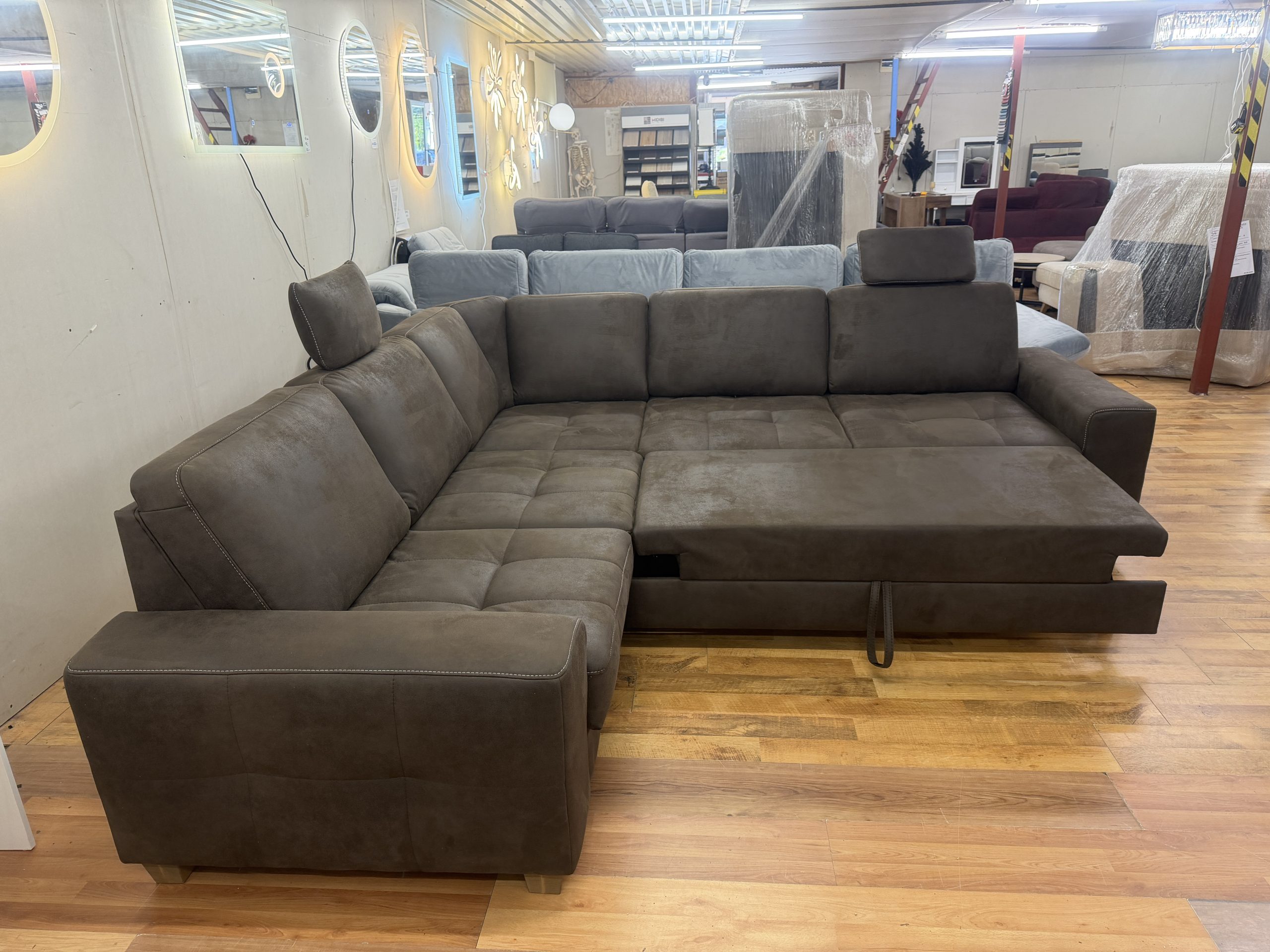 Puccini sarokkanapé barna alcantara kárpittal, ágyfunkcióval és ülésmélység-állítással - MH Bútor