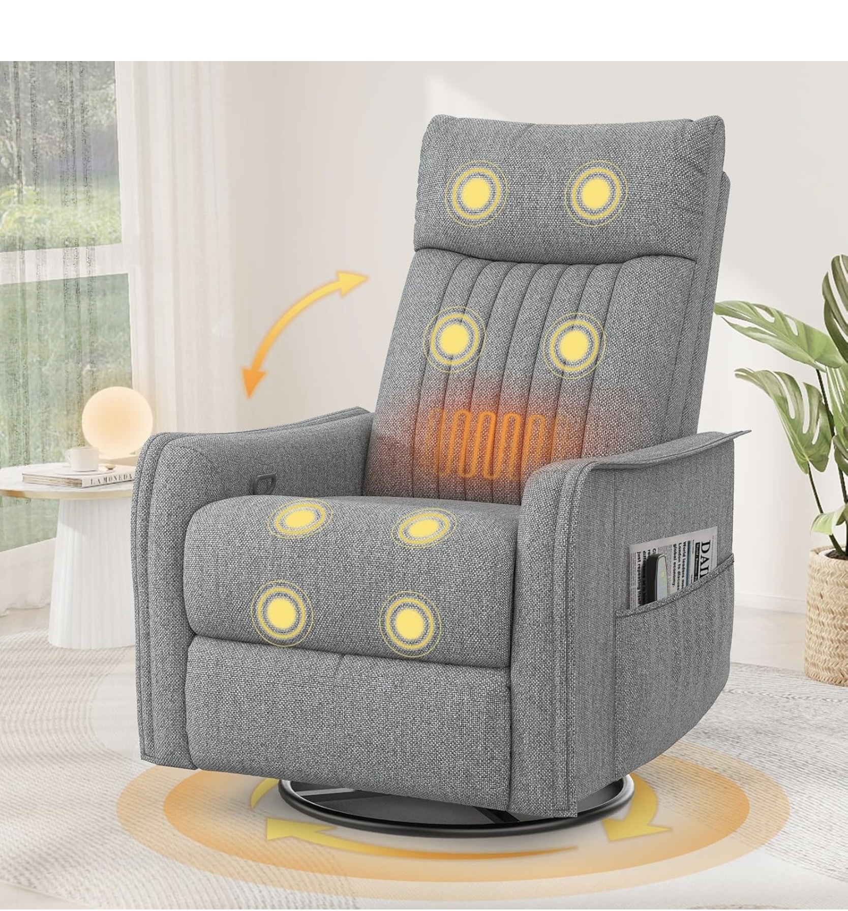 A fotel beépített 8 pontos vibrációs masszázsrendszerrel rendelkezik, amely a váll, a hát és a combok területén segít a feszültség oldásában. Az 5 masszázsmód és a 2 intenzitási szint személyre szabható használatot biztosít, míg a deréktáji fűtés tovább növeli a kényelmet. A praktikus kialakítást a karfák melletti oldalzsebek teszik teljessé.