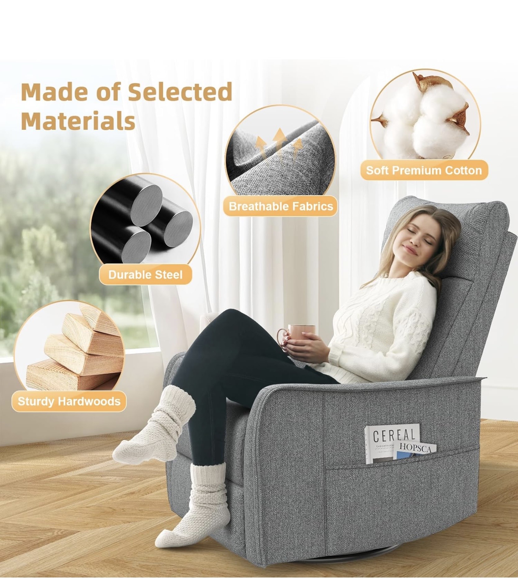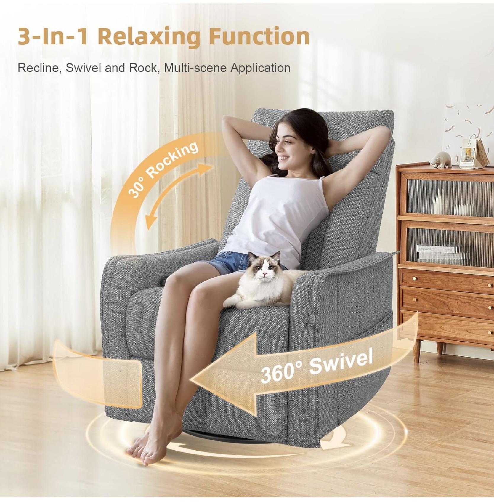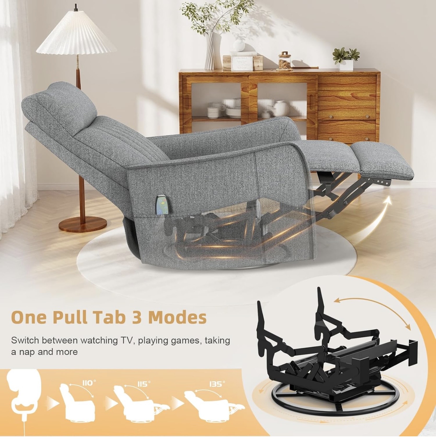 Ez a modern kialakítású relax fotel remek választás azok számára, akik nemcsak kényelmes, hanem funkciókban gazdag ülőbútort keresnek. A modell 3 az 1-ben kialakítású: használható ringó fotelként, forgó fotelként, valamint dönthető relax fotelként is. A háttámla több pozícióban állítható, egészen 135°-ig dönthető, így könnyedén kialakítható a pihenéshez legideálisabb testhelyzet.