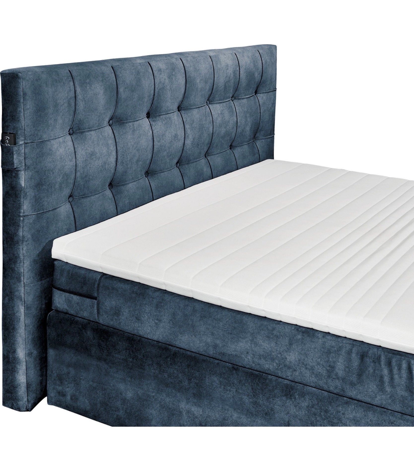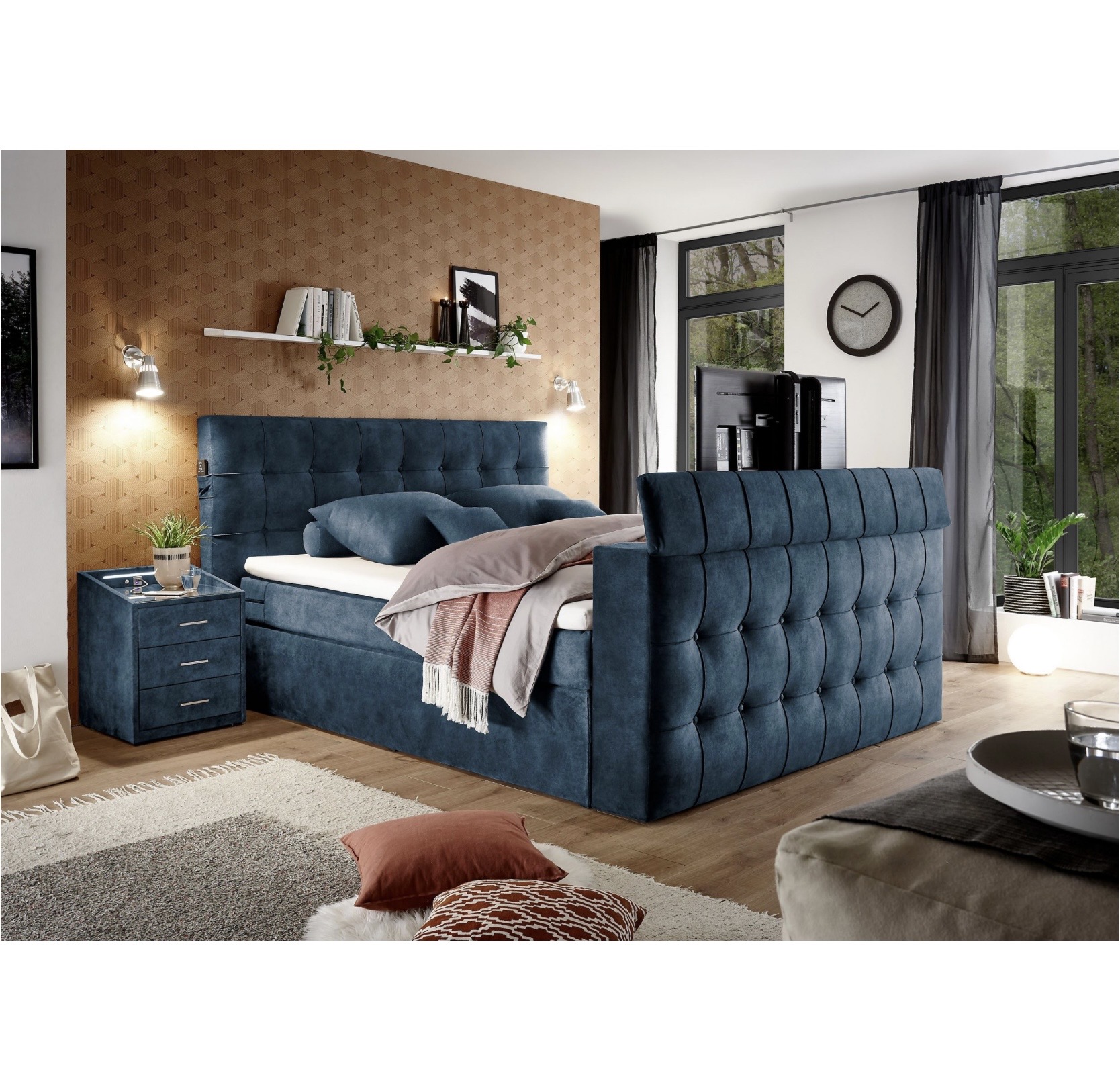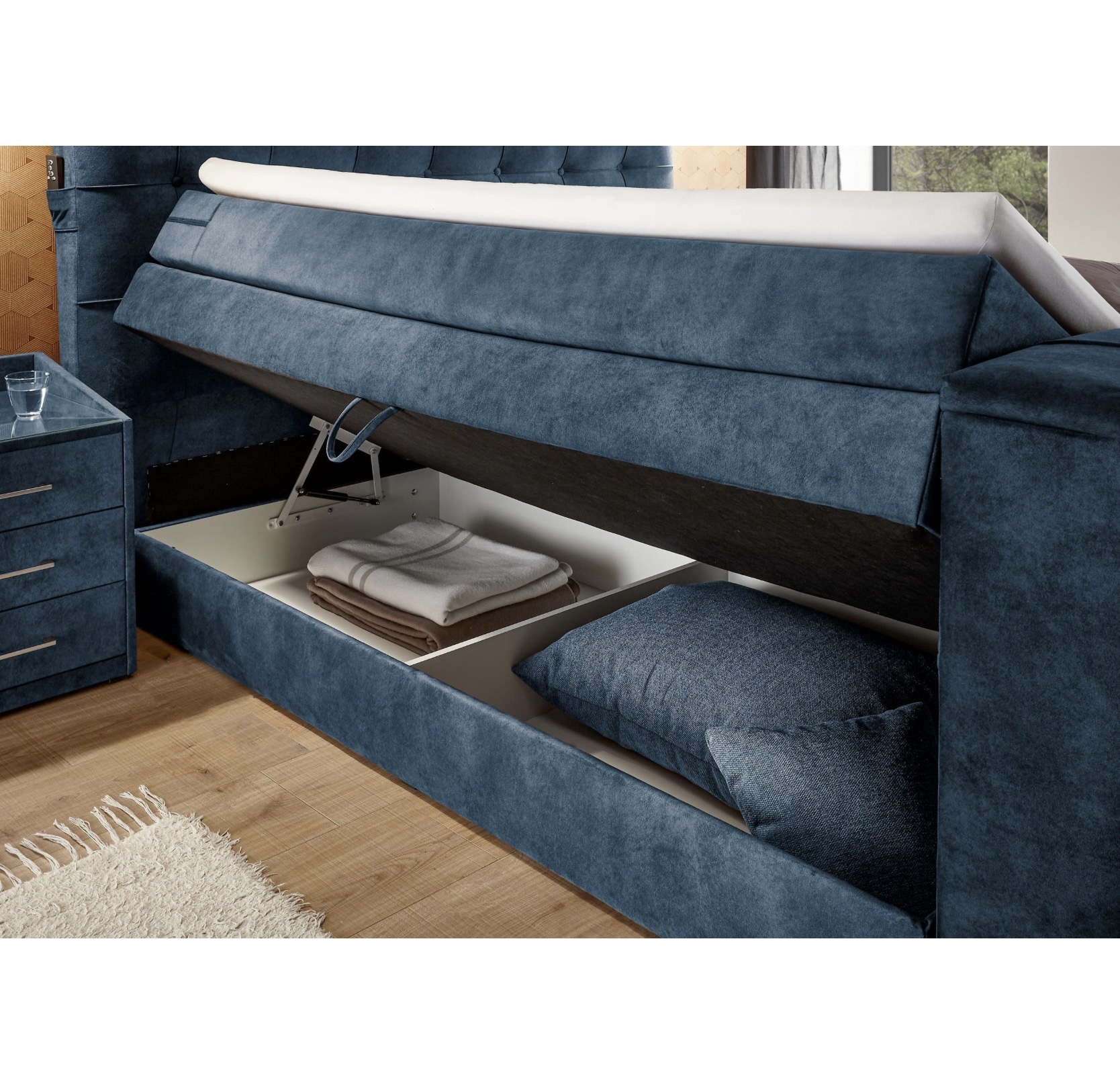 RICHMOND boxspring ágy – süllyeszthető TV-tartóval + távirányítóval – 180×200 cm – ágyneműtartós