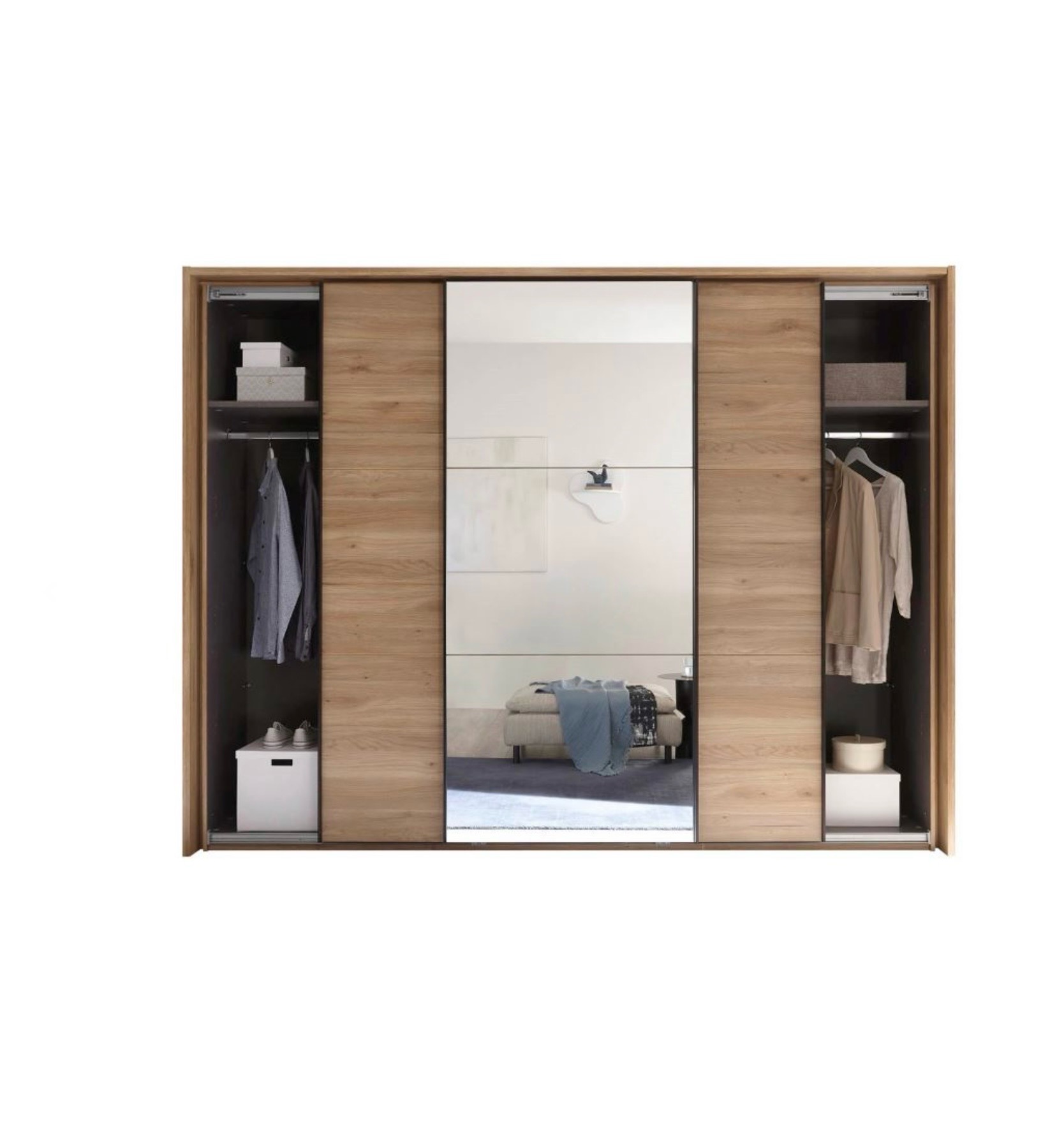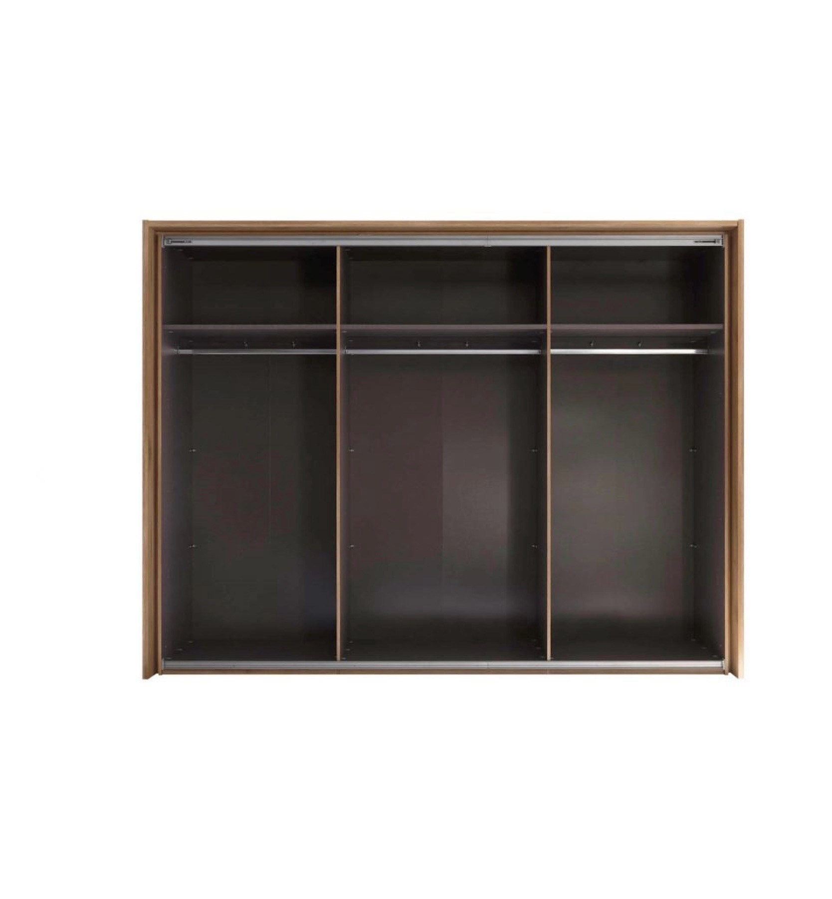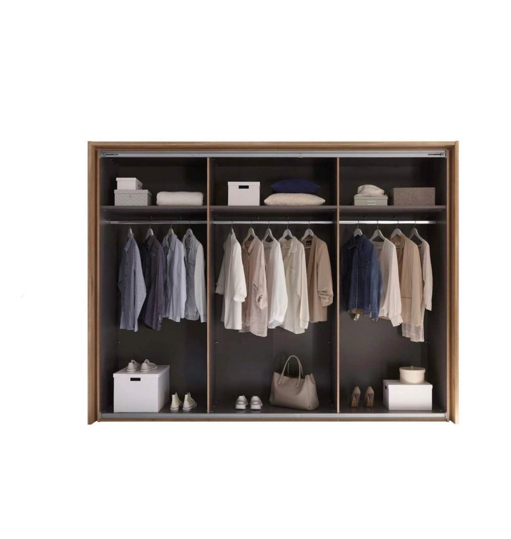 Sötét San remo-antracit színösszeállítású, belül három részre osztott, függesztett tolóajtós szekrény, melynek a középső ajtaja tükrös. Mindhárom részében egy-egy polc, alatta pedig vállfatartó rúd található, de tetszőlegesen tudunk bele még polcokat biztosítani, részenként + három-három darabot akár, melynek költsége 4500 ft/ db.