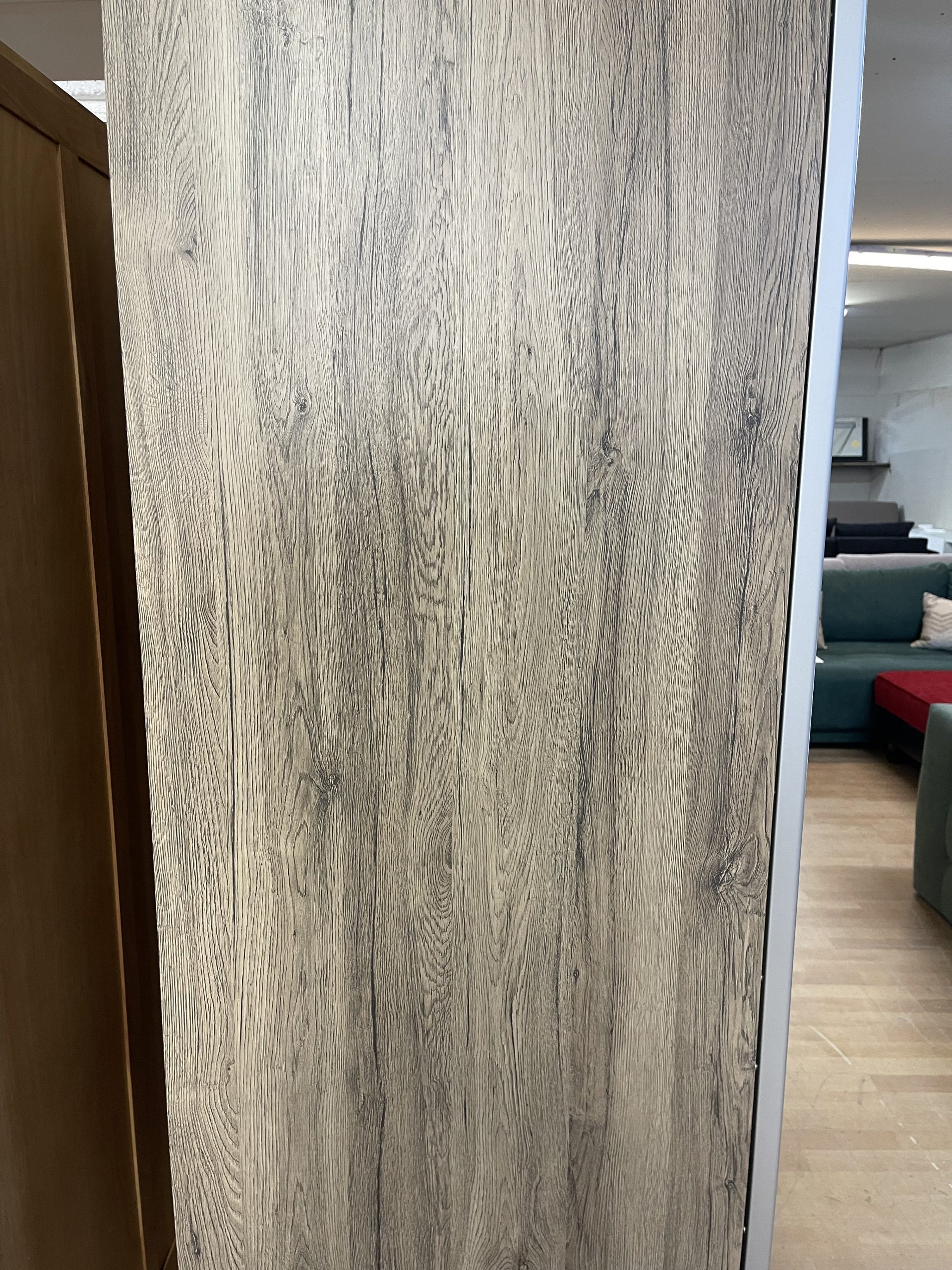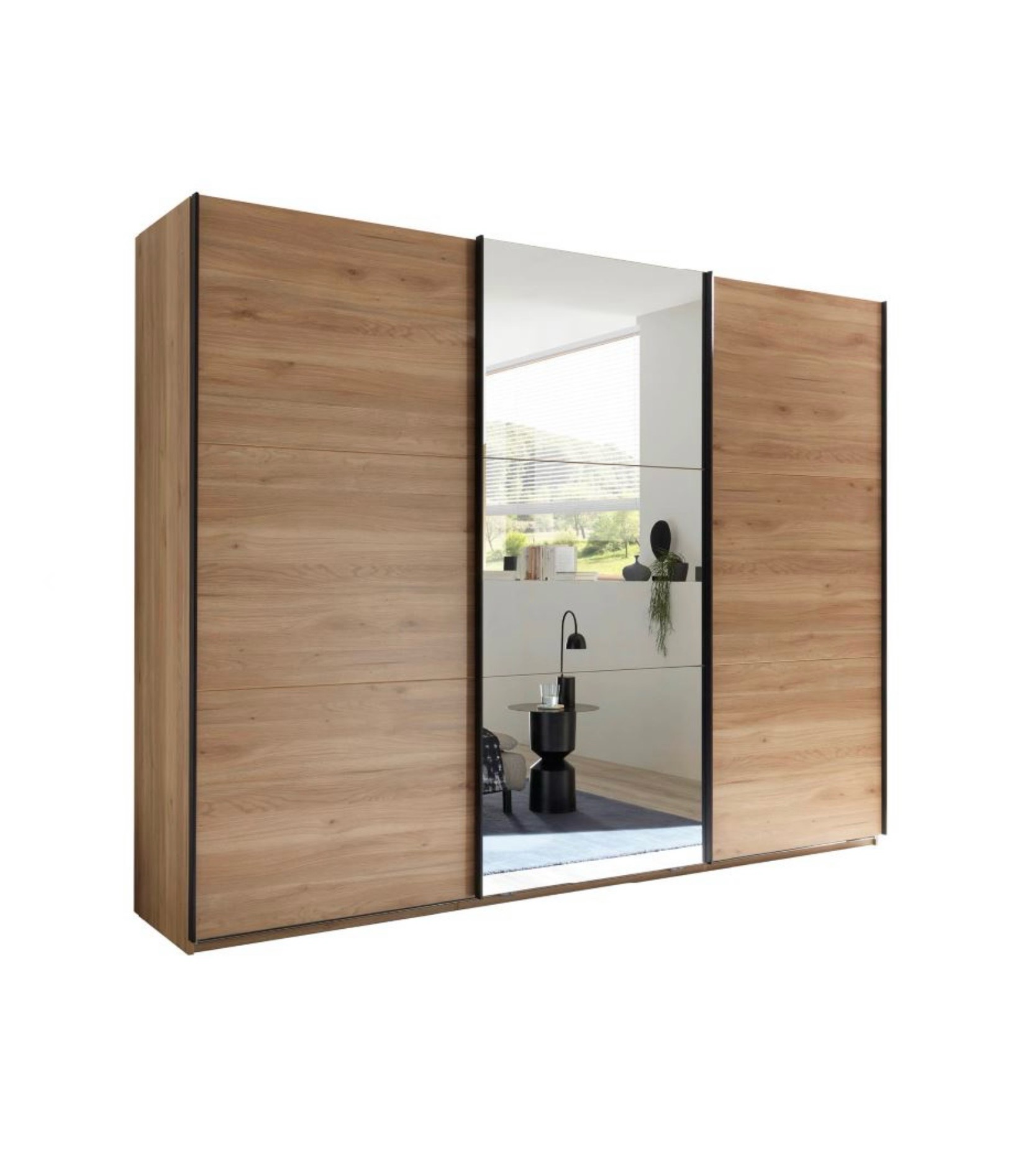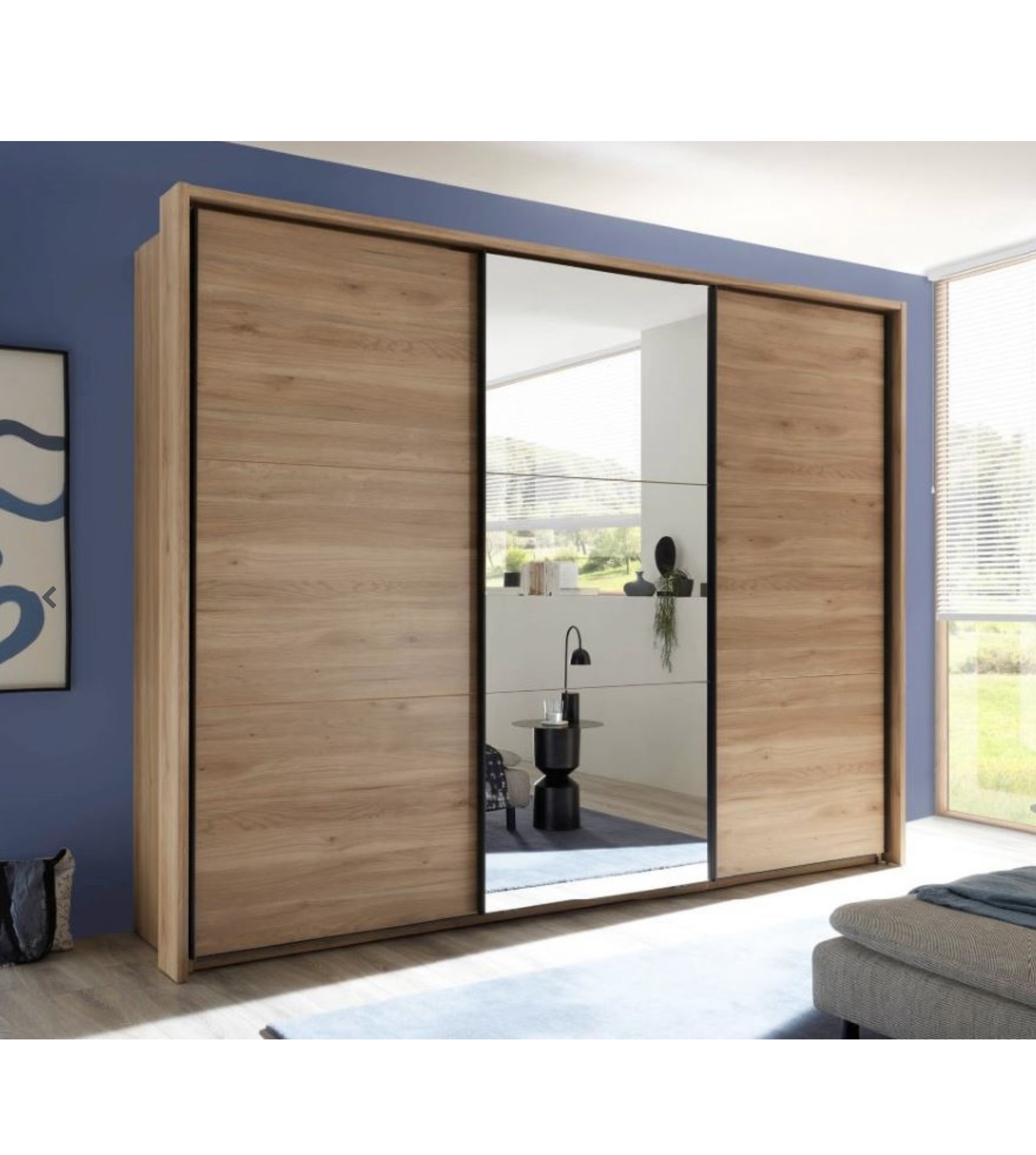 Sötét San remo-antracit színösszeállítású, belül három részre osztott, függesztett tolóajtós szekrény, melynek a középső ajtaja tükrös. Mindhárom részében egy-egy polc, alatta pedig vállfatartó rúd található, de tetszőlegesen tudunk bele még polcokat biztosítani, részenként + három-három darabot akár, melynek költsége 4500 ft/ db.