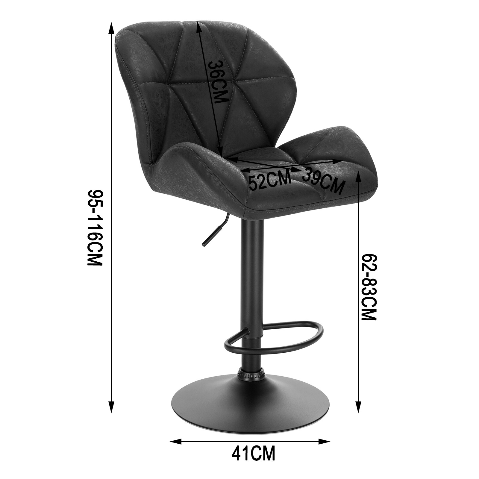 A bárszék ekobőr ülőfelülettel és fém vázzal készül. A gyártói és kereskedői adatok alapján a teljes magassága kb. 95–116 cm, szélessége kb. 50–52 cm, ülőfelületének mélysége kb. 39–40 cm. A termék maximális terhelhetősége kb. 120 kg.